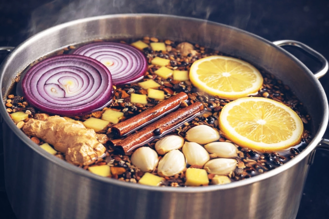 Gather: 1-inch fresh ginger (sliced), 2-3 cinnamon sticks, 1 tsp whole cloves, 2-3 garlic cloves (lightly crushed), 1 small red onion (sliced), juice and zest of 1 lemon, 1 cup pineapple chunks. Add to 4-5 cups water in a pot. Bring to gentle boil, then simmer 15 minutes. Strain and enjoy warm. Optional: touch of honey after cooling slightly. Prepare fresh daily or store refrigerated up to 3 days and reheat gently.