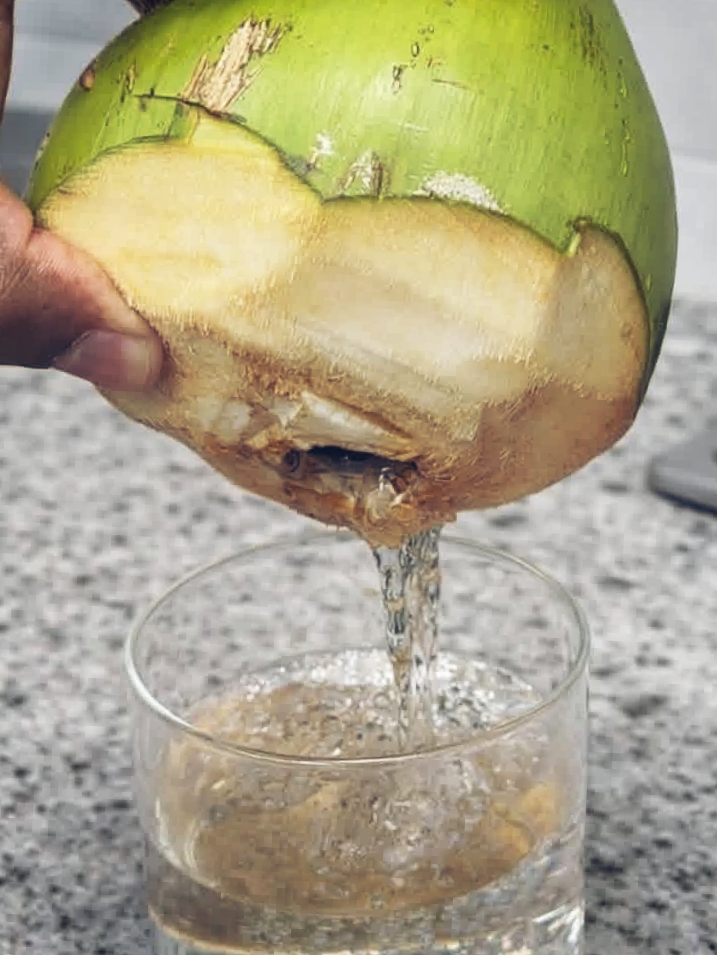 The image shows a hand holding a freshly opened green coconut, pouring its clear water into a glass. This simple moment represents the beauty of natural and healthy living. Coconut water, taken directly from the fruit, is one of natureβs purest drinks, known for its refreshing taste and nutritional benefits.