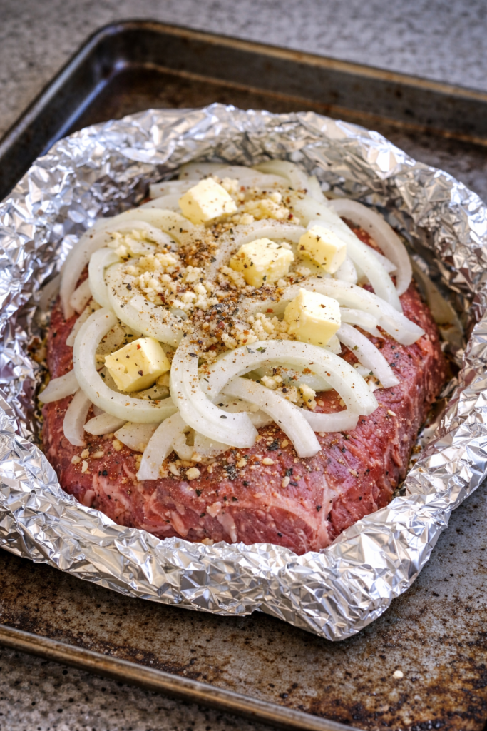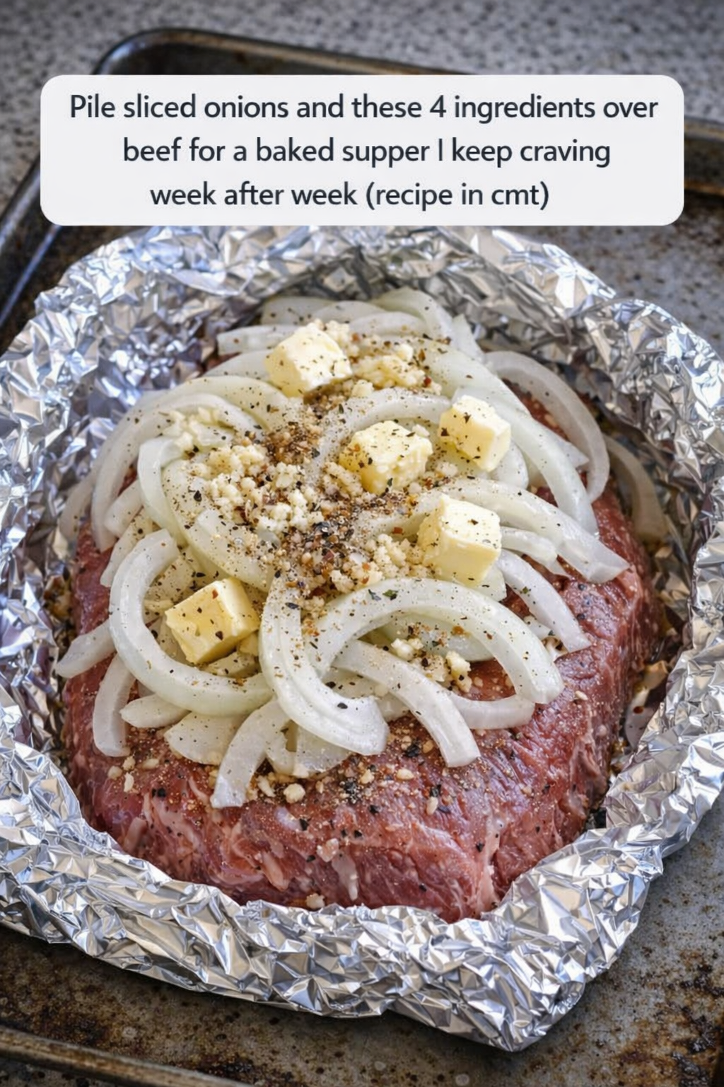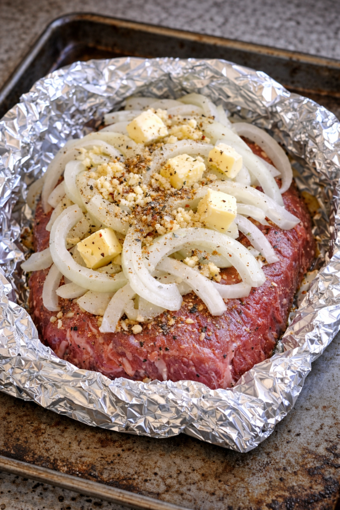 This is one of those effortless oven recipes that turns simple ingredients into a rich, melt-in-your-mouth meal. A tender cut of beef is baked slowly in foil with sweet onions, butter, garlic, and seasoning, creating its own flavorful sauce. Perfect for busy days, family dinners, or when you want something cozy without standing in the kitchen.