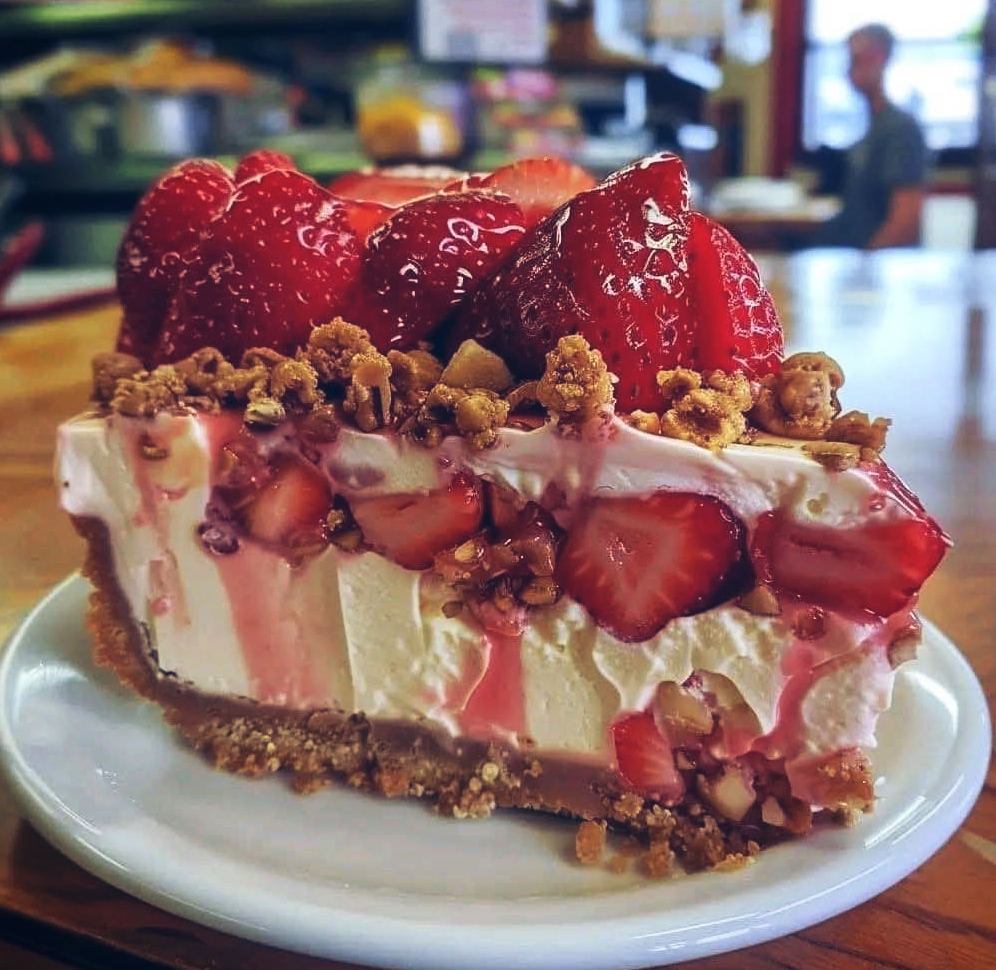 Serve chilled for the best texture. The creamy cheesecake with sweet strawberries and crunchy topping is irresistible!